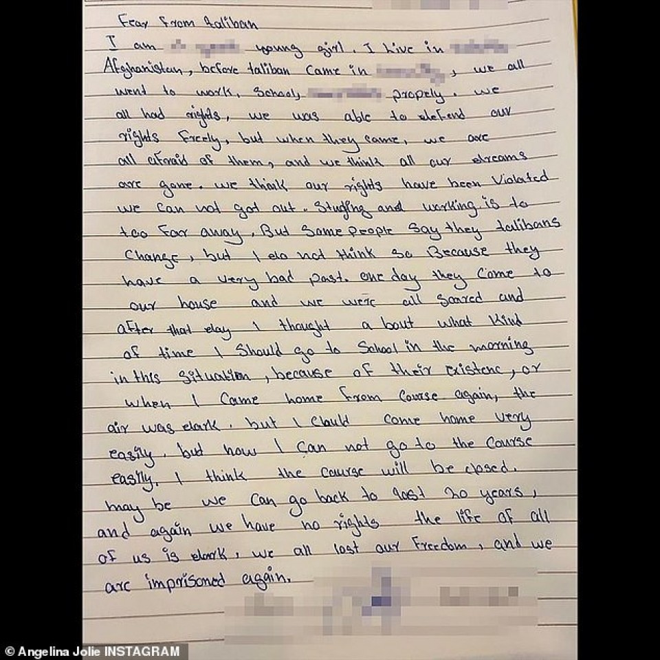Angelina Jolie comparte carta de niña afgana en Instagram