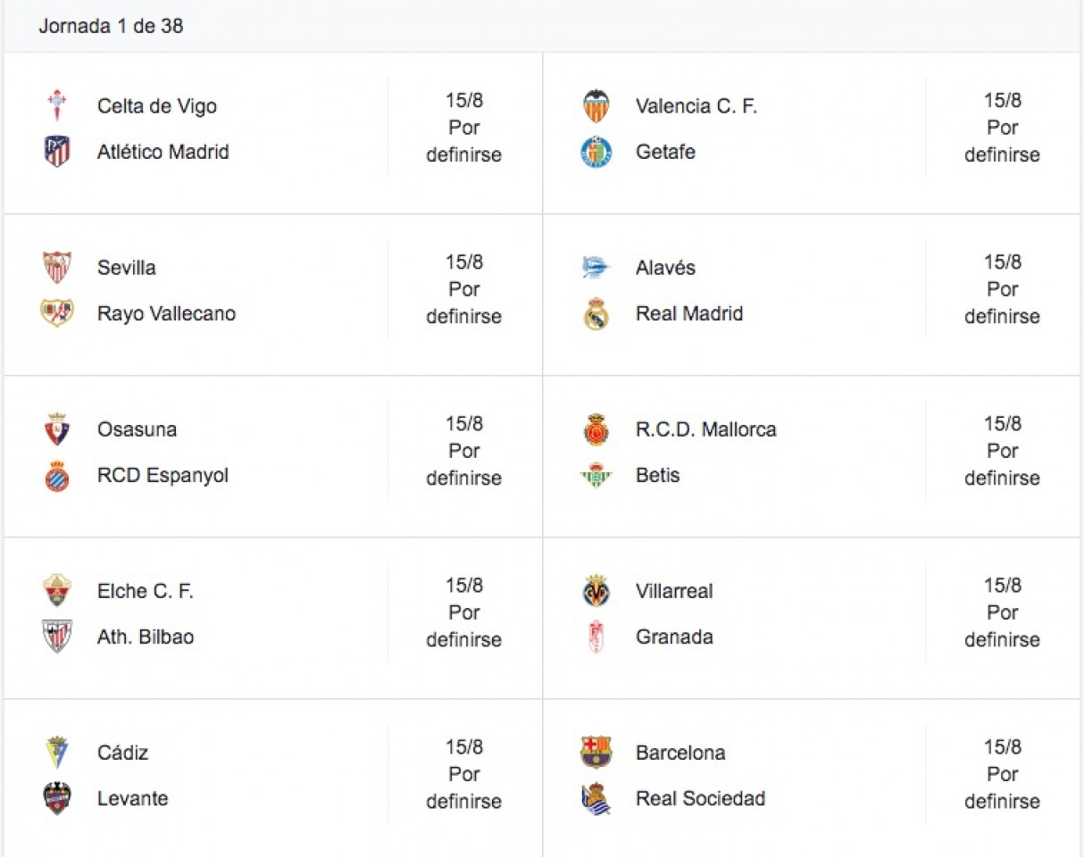 El Atlético de Madrid empezará la defensa del título de campeón ante el Celta de Vigo en la primera jornada de LaLiga Santander 2021-2022, en la que el Real Madrid visitará al Alavés y el Barcelona recibirá a la Real Sociedad.
