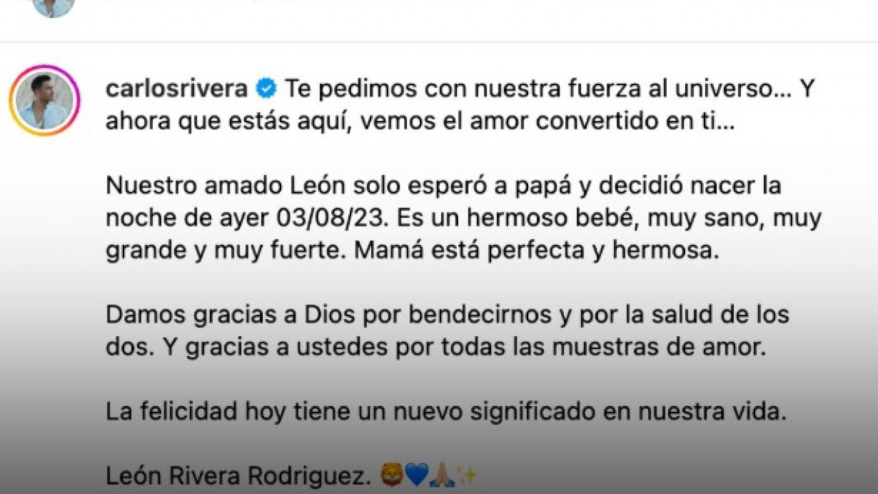 En comunicado conjunto, la pareja agradeció el cariño de sus seguidores y a Dios por la bendición y la salud del pequeño y de su mamá, quien está “perfecta y hermosa”.