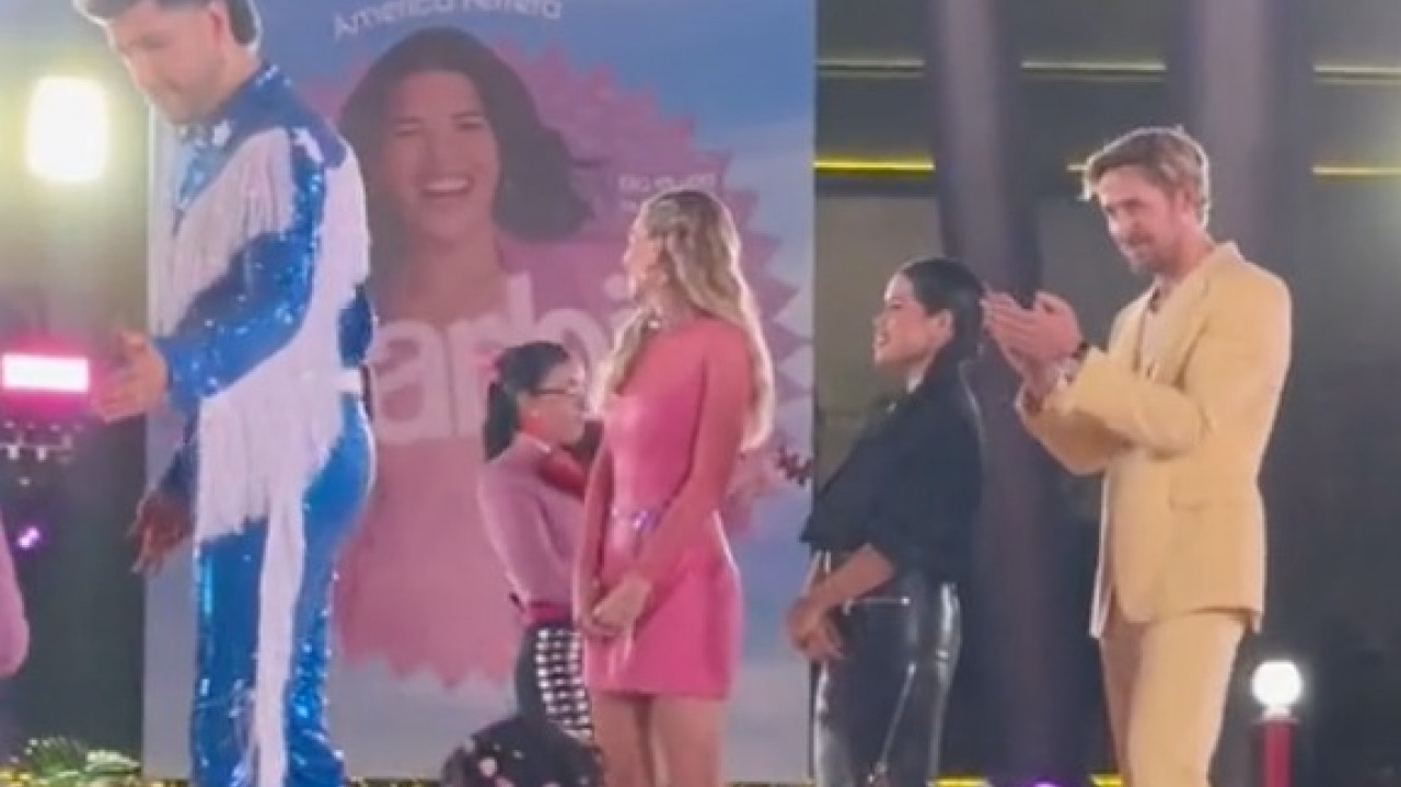 Margot Robbie y Ryan Gosling, protagonistas de la cinta, fueron recibidos con mariachi, conformado sólo de mujeres, quienes estaban vestidas de color rosado.