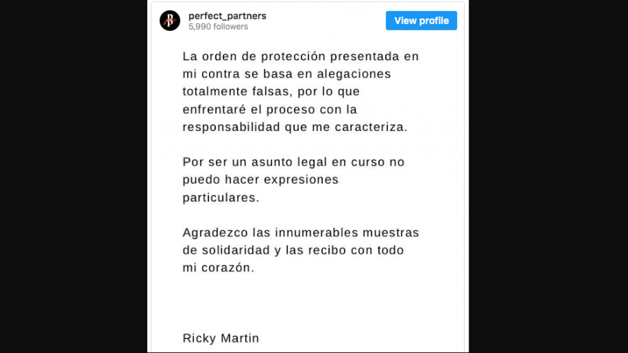 Por su parte, Ricky Martin dijo en comunicado que la orden “se basa en alegaciones totalmente falsas, por lo que enfrentaré el proceso con la responsabilidad que me caracteriza”.