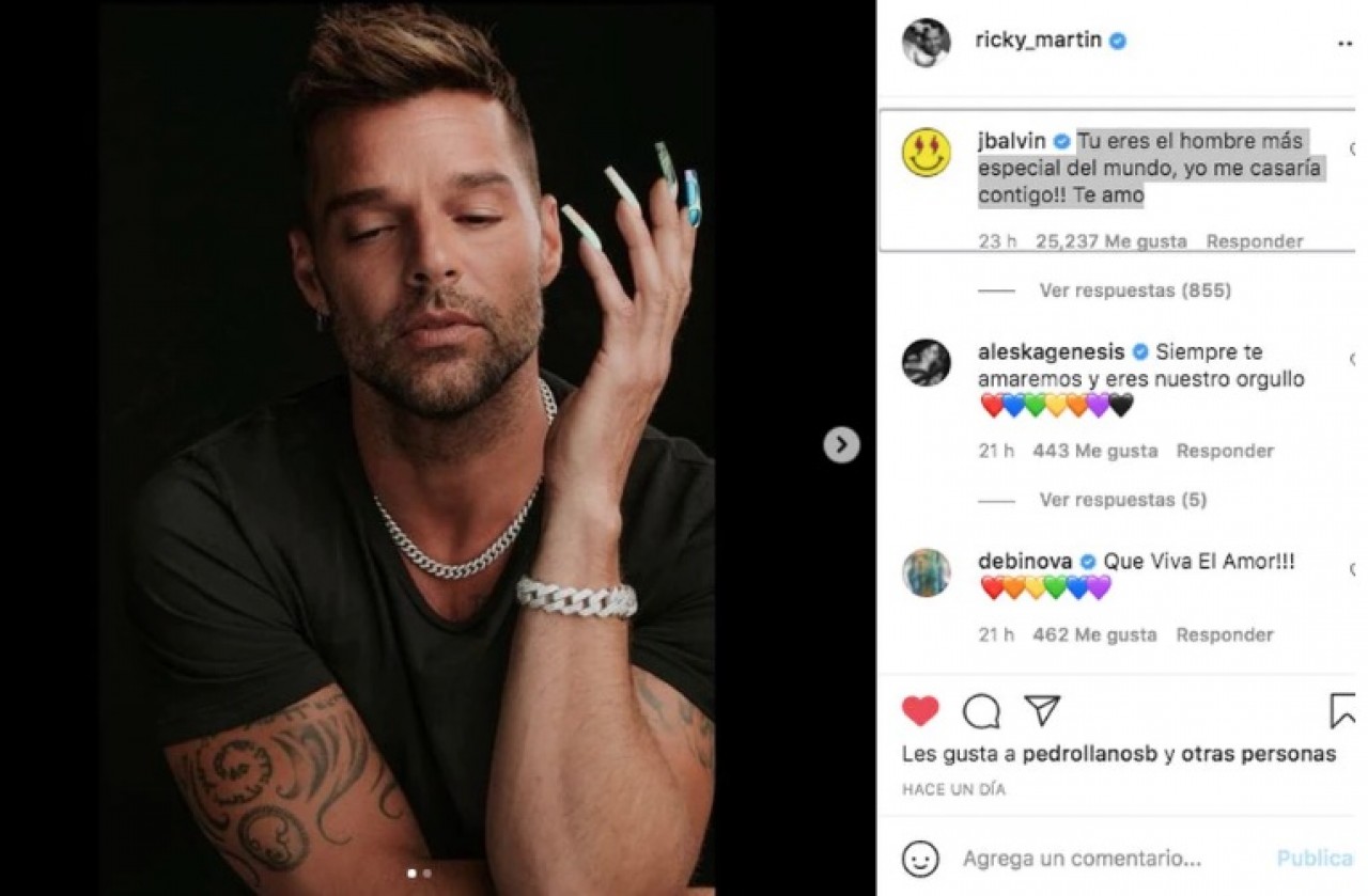 Después de que Ricky Martin publicó un contundente mensaje de aceptación para sus seguidores y detractores, J Balvin respondió con un “te amo” y “me casaría contigo” al cantante boricua.