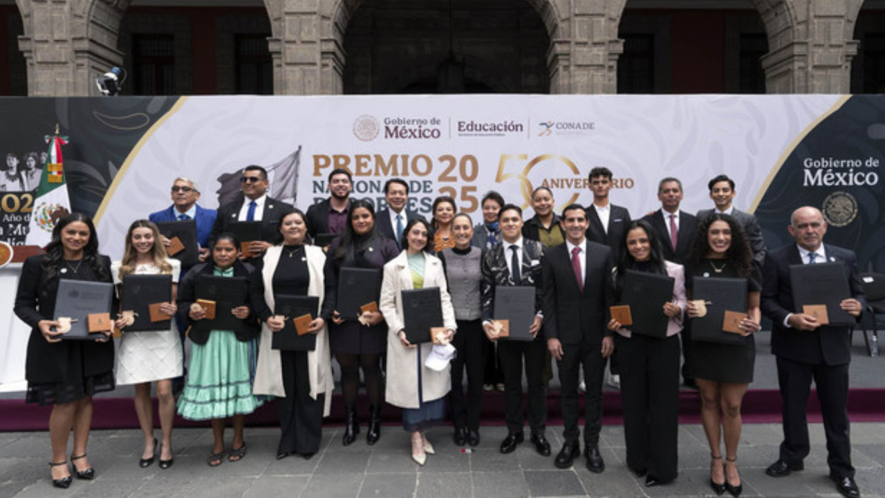 La Presidenta Claudia Sheinbaum Pardo reconoció a 16 atletas mexicanos, entrenadores, jueces/árbitros con el Premio Nacional de Deportes 2025, en su 50 Aniversario, a quienes agradeció por la alegría que le brindan al pueblo de México en cada momento que ponen en alto el nombre del país.