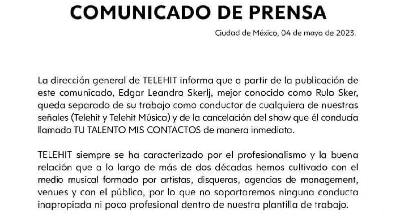 “La dirección general de TELEHIT informa que a partir de la publicación de este comunicado, Edgar Leandro Skerlj, mejor conocido como Rulo Sker, queda separado de su trabajo como conductor de cualquiera de nuestras señales (Telehit y Telehit Música) y de la cancelación del show que él conducía llamado TU TALENTO MIS CONTACTOS de manera inmediata”, se lee en la misiva.