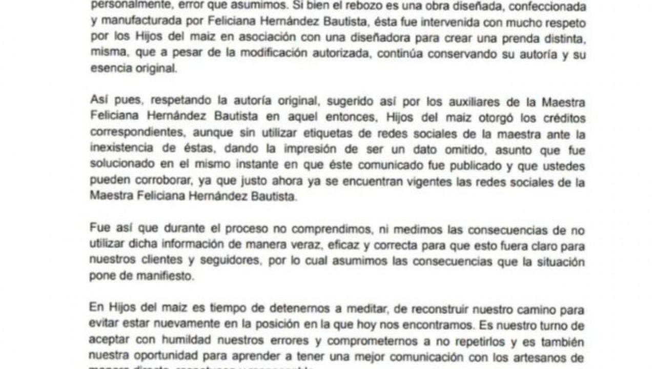 Poco después, Hijos del Maíz hizo una disculpa pública por no darle crédito a Feliciana, mientras que Huerta emitió un comunicado en el que lamentó lo sucedido.