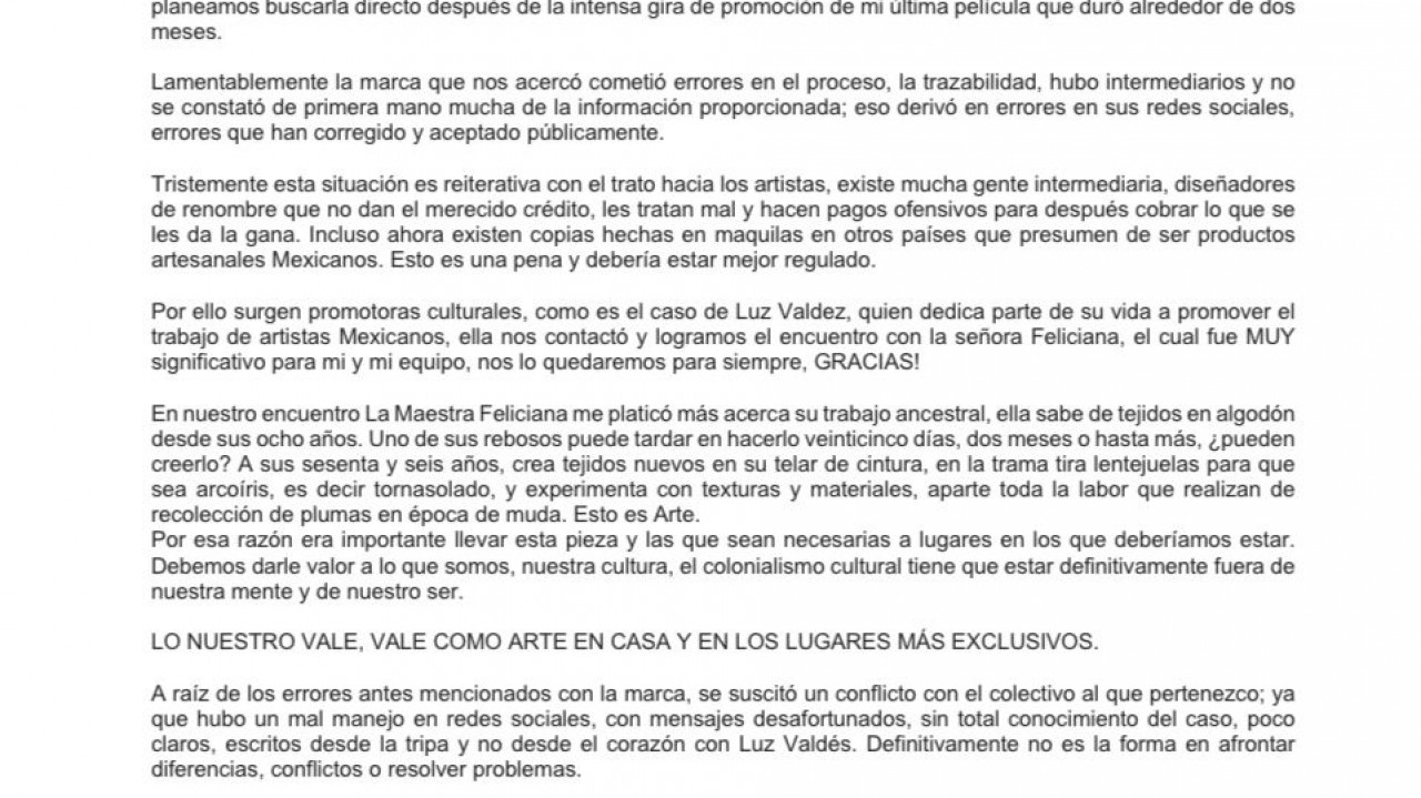 Asimismo, dijo que la artesana le pidió ayuda para que reconocieran su trabajo, a lo que Poder Prieto, el colectivo del que forma parte Huerta, señaló que no era cierto y que ellos se habían puesto en contacto directo con Hernández para que conociera al actor.