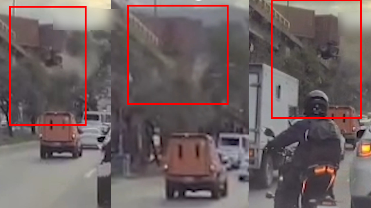 El momento fue grabado por automovilistas cercanos y el video se observa que el tráiler golpea uno de los muros de contención y este cae sobre vehículos que circulaban por la parte de abajo del puente.