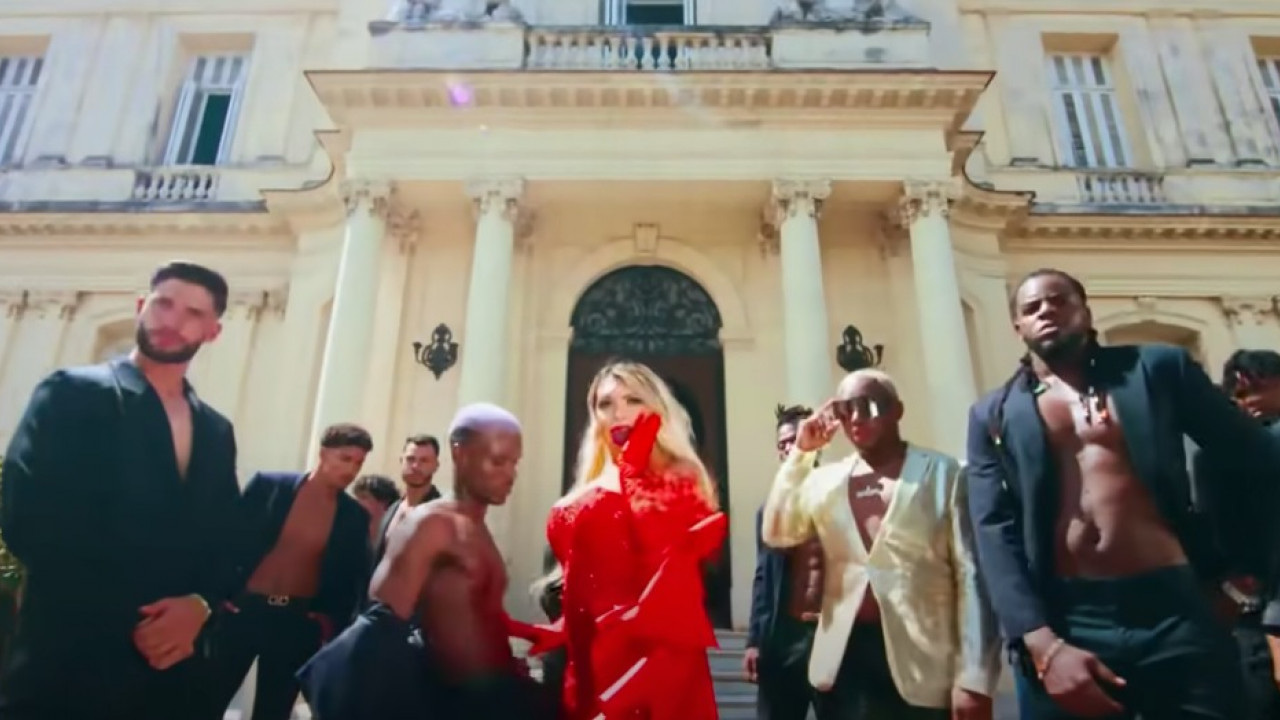 En el clip, la influencer está rodeada de cámaras, lujos y bailarines, mientras usa el micrófono rosa del reality show.