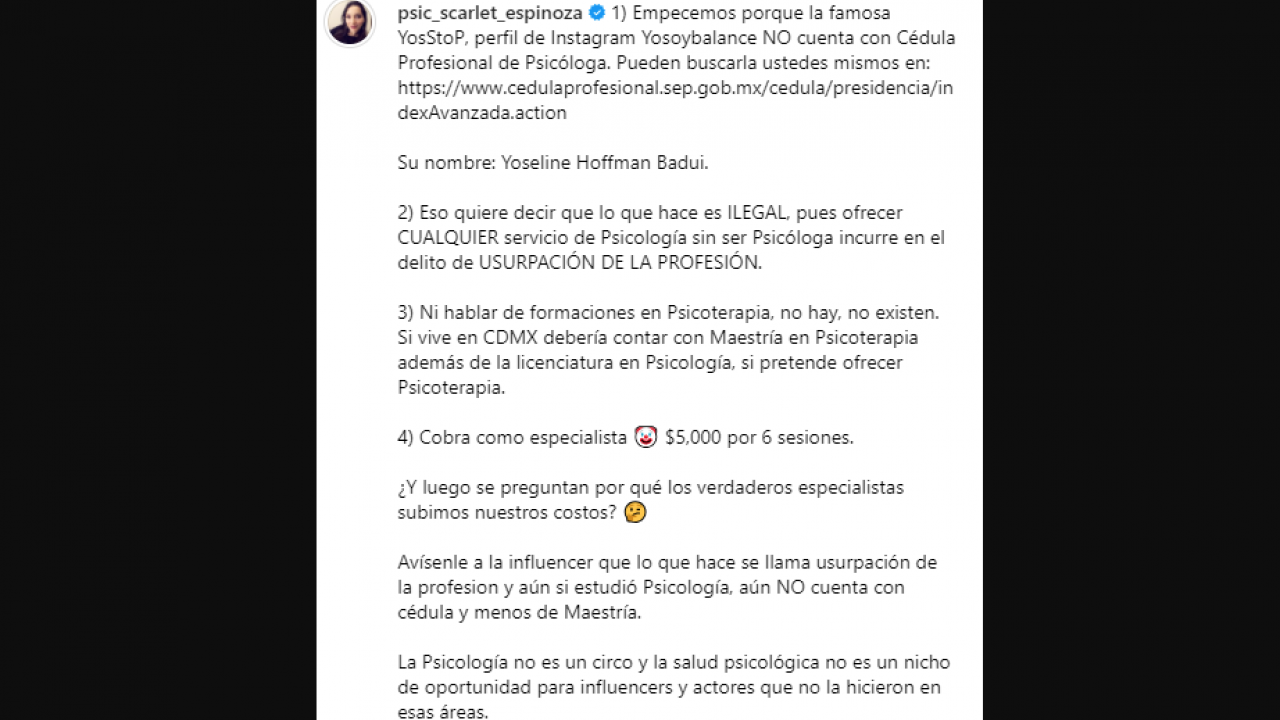 Scarlet Espinoza, psicóloga clínica, señaló que la influencer no cuenta con cédula profesional y mostró una captura de pantalla del Registro Nacional de Profesionistas.