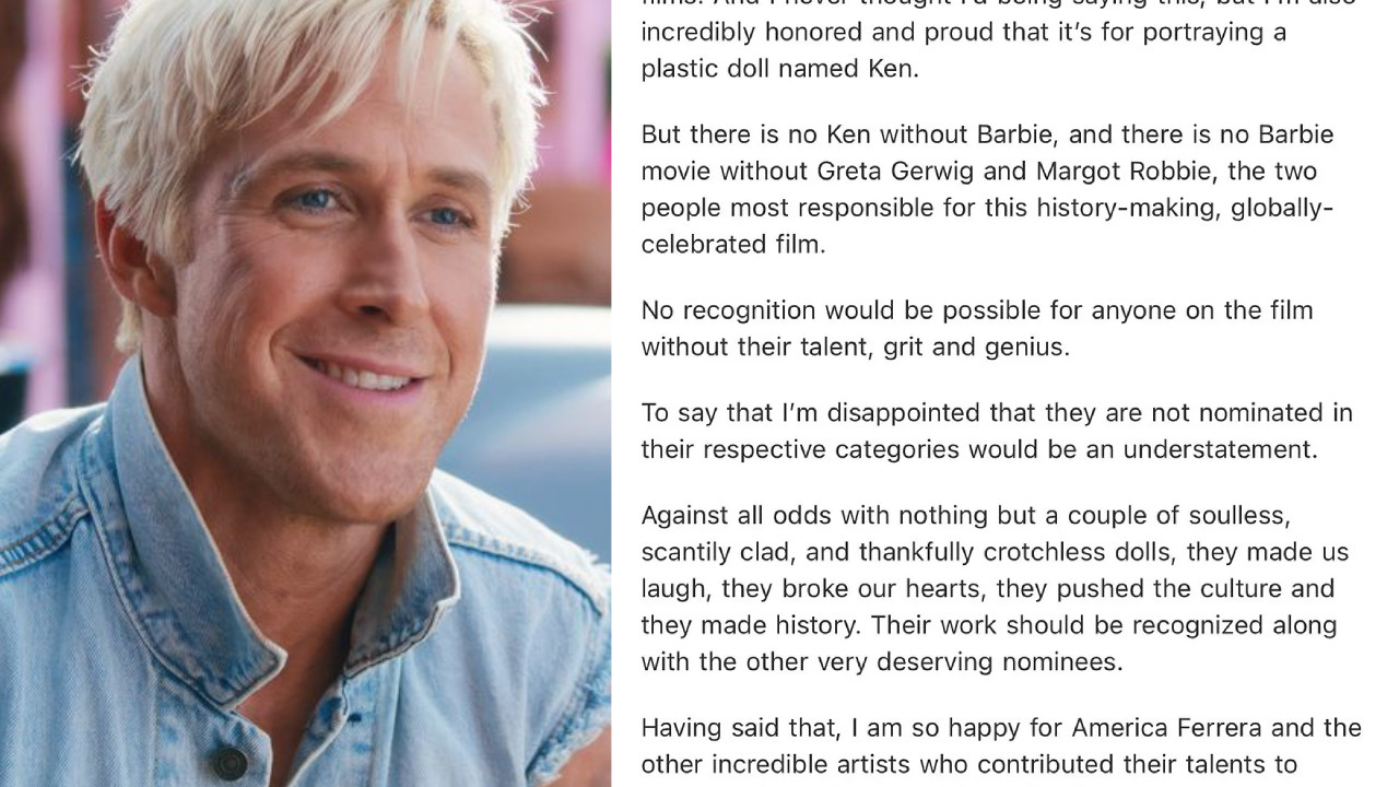 Ryan Gosling critica falta de nominación para Gerwig y Robbie en los Oscars
