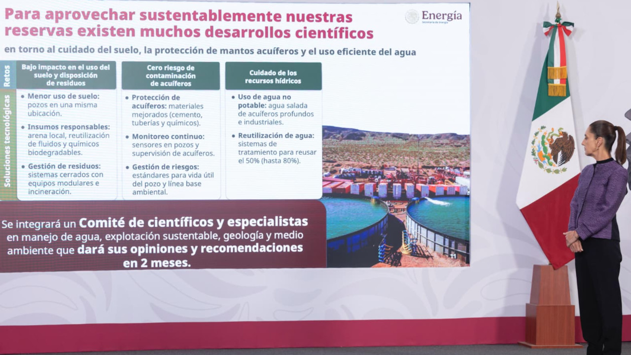 Sheinbaum indicó que, en el caso de los yacimientos no convencionales, se creará un comité de científicos y especialistas en manejo de agua, geología, explotación sustentable y medio ambiente, que presentará recomendaciones en un plazo de dos meses sobre la viabilidad de su explotación.