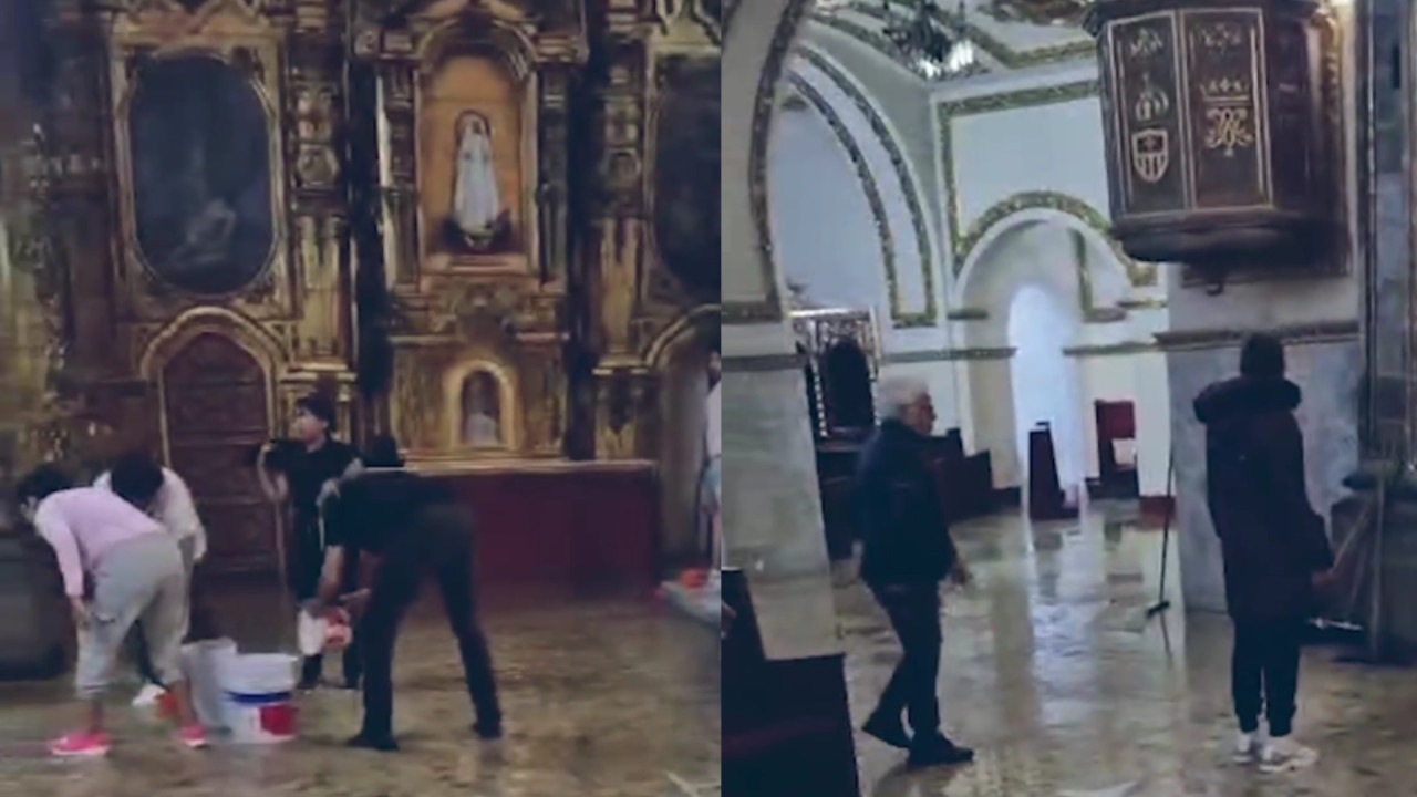 Con cubetas, recogedores y botes, feligreses y personal del lugar retiraron el agua para evitar daños a la estructura.
