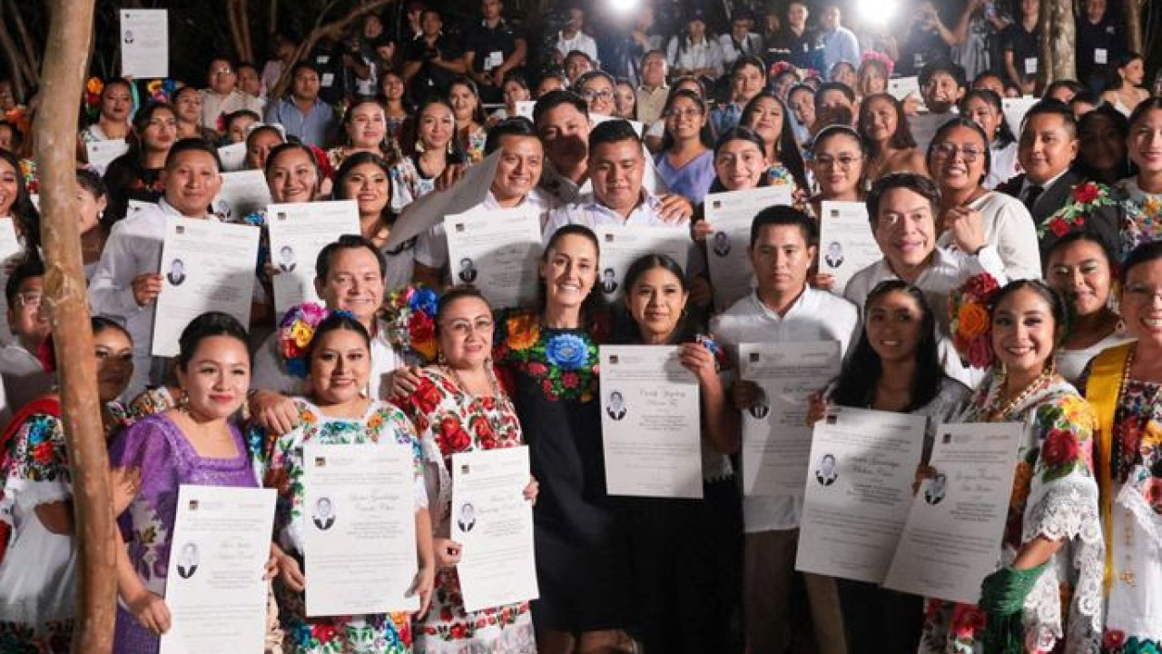 En Valladolid, Yucatán, la Presidenta de México, Claudia Sheinbaum Pardo, realizó la entrega de 117 títulos profesionales a egresados de la carrera de Formación Docente en Educación Básica de las Universidades para el Bienestar Benito Juárez García (UBBJG).