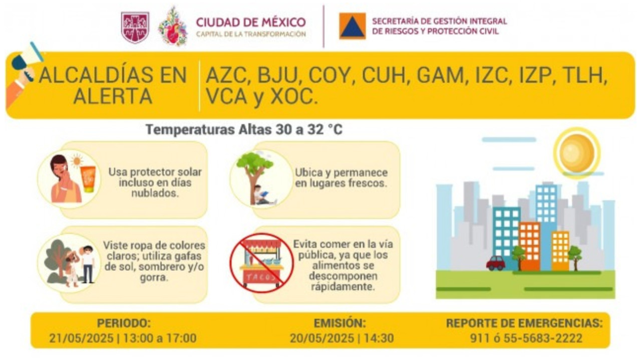 La Secretaría de Gestión Integral de Riesgos y Protección Civil (SGIRPC) activó la alerta amarilla por altas temperaturas en la CDMX.