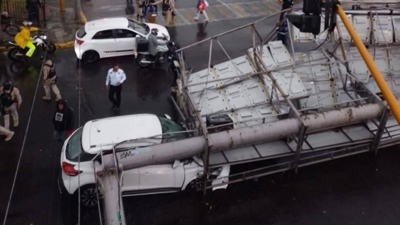 Por las fuertes lluvias, un espectacular cayó sobre un auto en la colonia Benito Juárez, a un costado del Centro de Justicia de Tlalnepantla, Edomex, con saldo blanco.