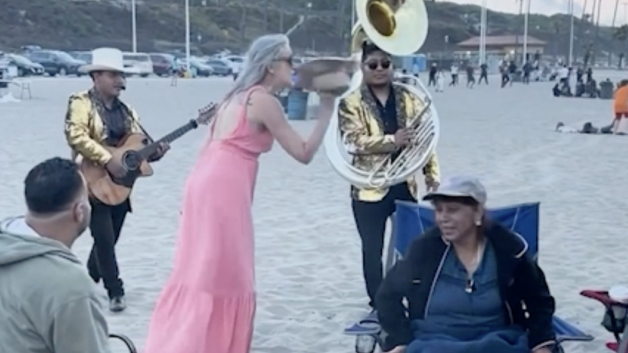 La cuenta Paisaboy compartió el momento en que una mujer estadounidense estalla contra el Grupo Herencia del Sur, que tocaba banda en las playas de Manhattan Beach, en California.