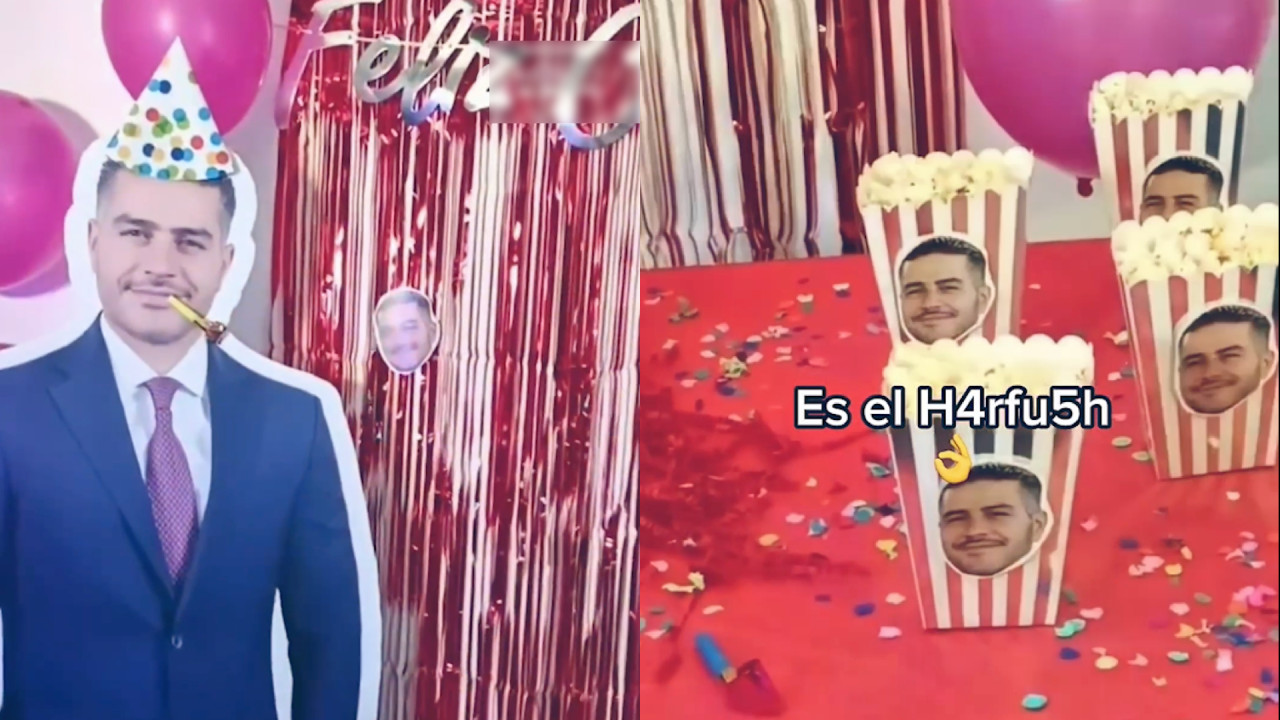 En un video se observan contenedores de palomitas, pastel y hasta una imagen tamaño real del funcionario.