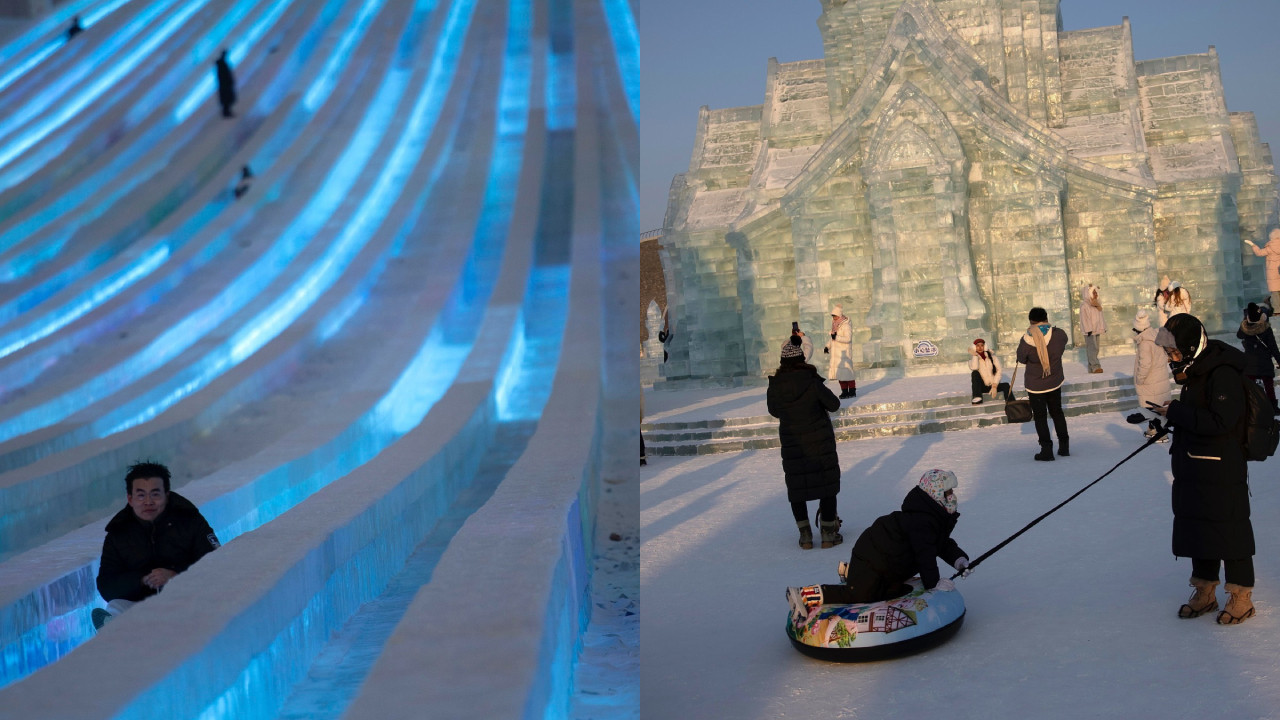 El lugar, construido en la ciudad de Harbin, está a unos 17 grados bajo cero, pero eso no detiene a los asistentes para jugar e interactuar con las estructuras como en un parque de diversiones.