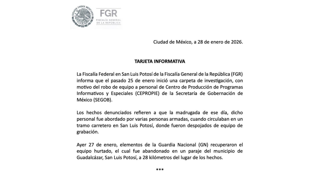Fue hasta el 28 de enero cuando la Fiscalía General de la República (FGR) detalló que los afectados fueron abordados por sujetos armados, quienes los despojaron de su equipo de grabación durante la madrugada.