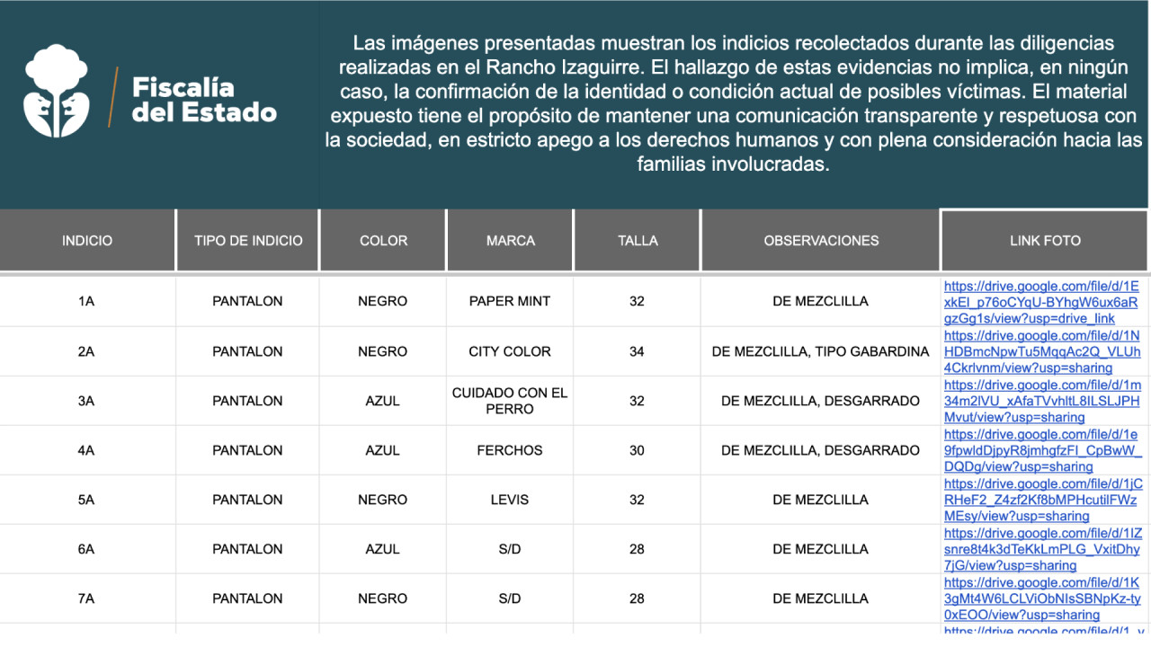 La Fiscalía General del Estado de Jalisco hizo público un documento en el que se enlistan todos los objetos encontrados en el campo de exterminio ubicado en Rancho Izaguirre.