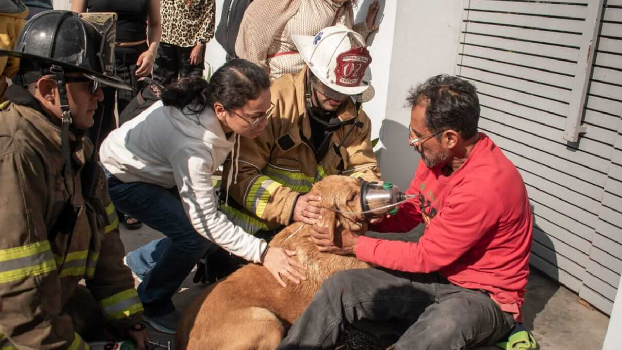 El peludito tuvo que ser atendido por inhalación de humo, por lo que Bomberos le colocaron una máscara de oxígeno.