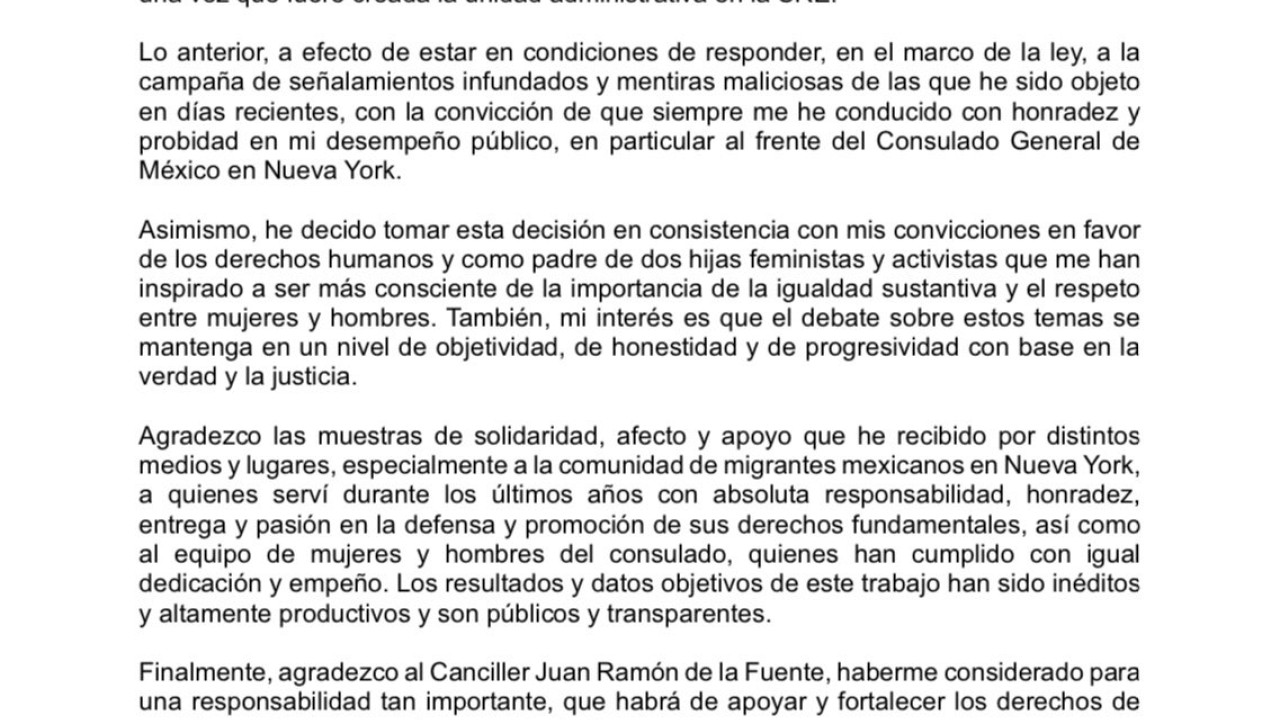 El excónsul mexicano en Nueva York afirma que su declinación es "a efecto de estar en condiciones de responder, en el marco de la ley, a la campaña de señalamientos infundados".