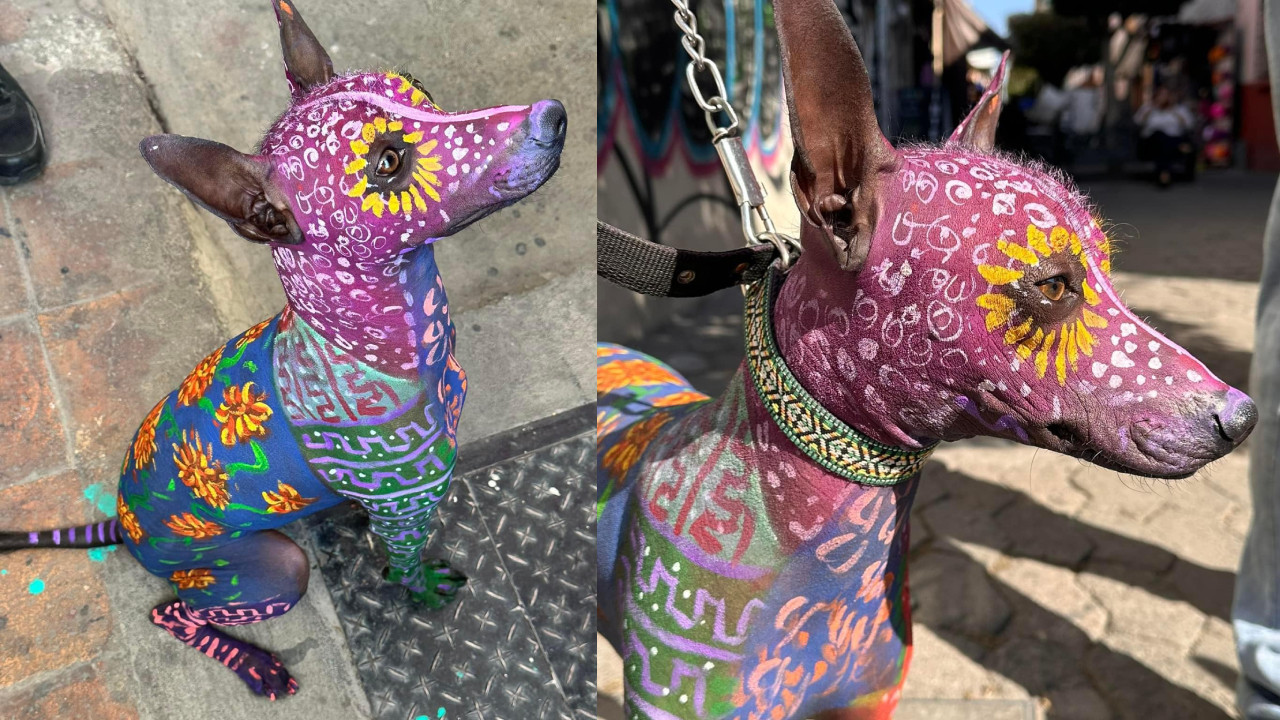Ella es Noa, una perrita xoloitzcuintle que fue pintada como un alebrije, para celebrar el Día de Muertos.