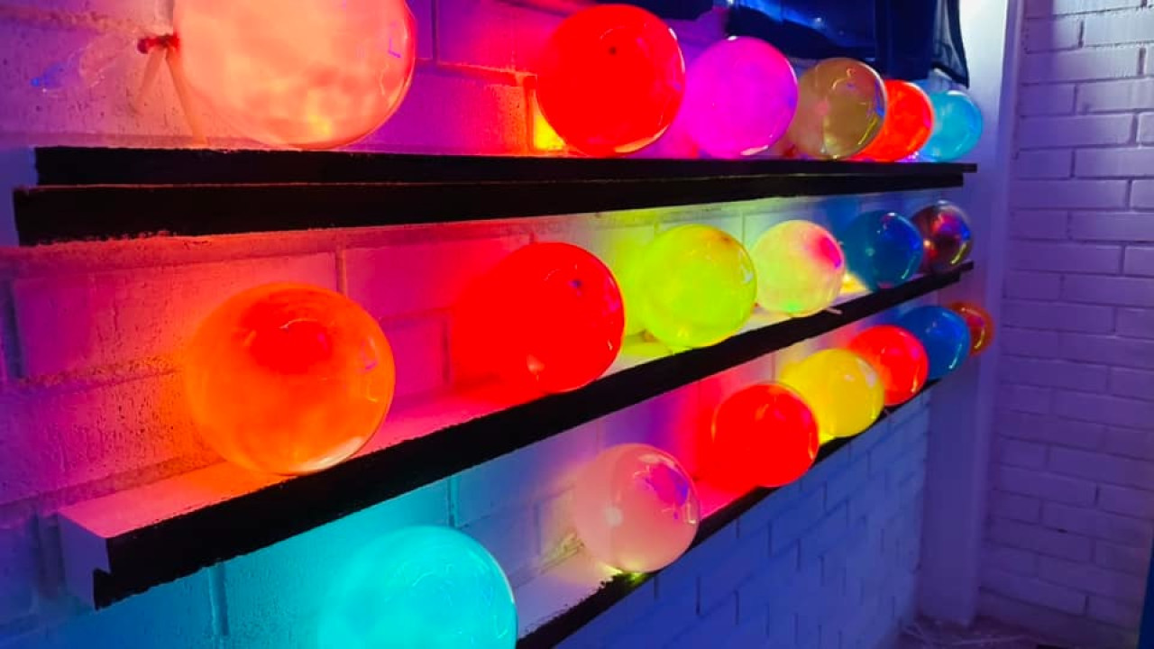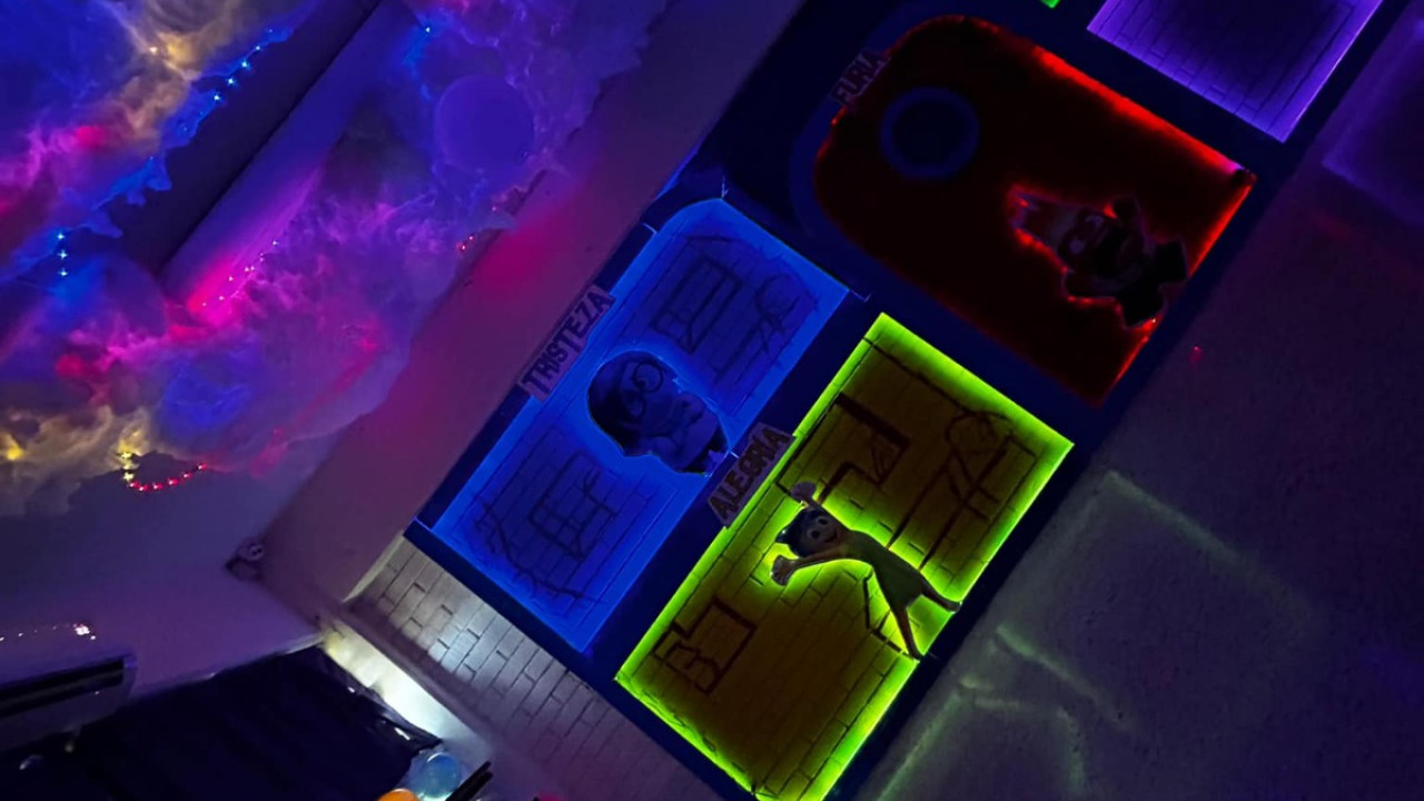 Puso las figuras de los personajes con luces neón y cubrió las ventanas para evitar la luz natural y darle el efecto de noche para que luzca todo.