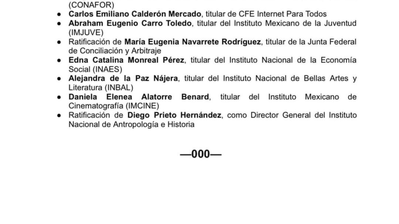 Seis de los puestos anunciados son ratificaciones de funcionarios y funcionarias del gobierno de López Obrador.