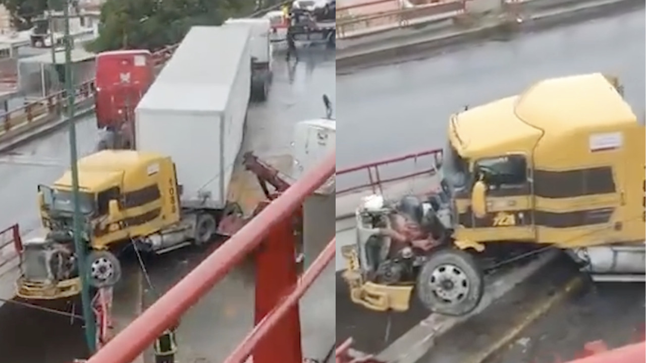 Así quedó colgando la cabina de un tráiler después de que perdió el control en el puente de la Avenida Jesús Reyes Heroles y Santa Rosa, en Tlalnepantla, Edomex.