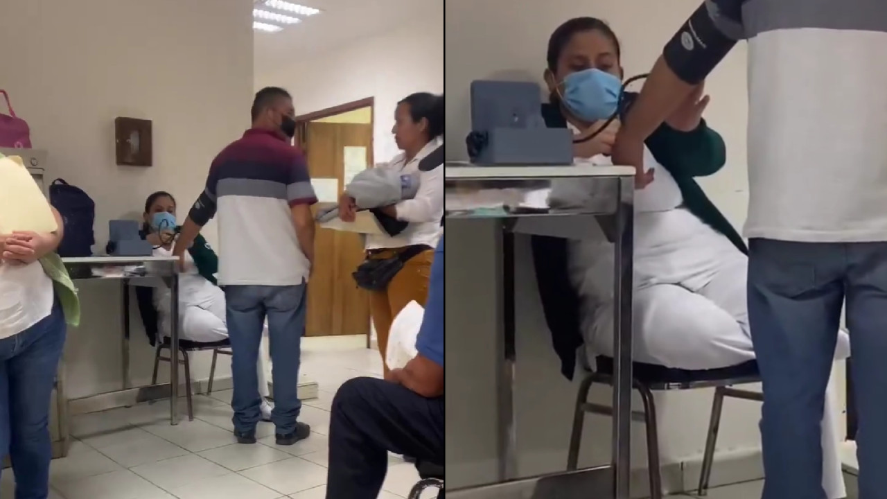 Captan a enfermera del IMSS tomando presión sentada y el paciente de pie